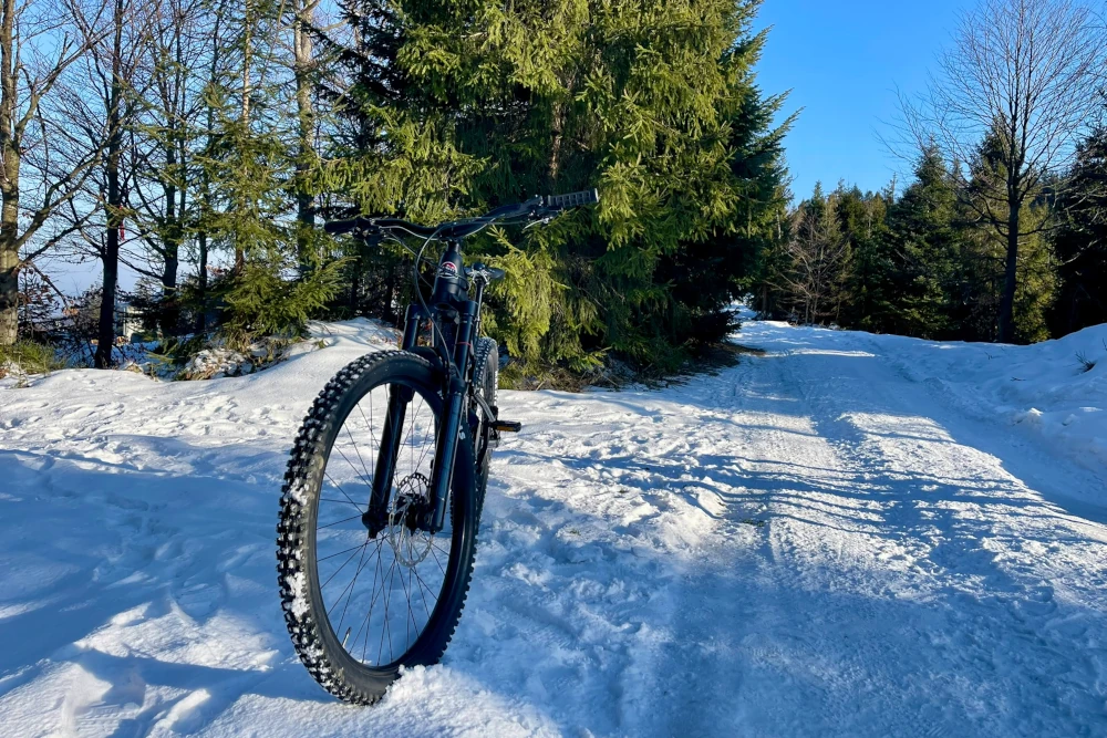 Z wypożyczalni kierujemy się ul. Olimpijską w dół do głównej drogi, skręcając po drodze w lewo w ul. Ondraszka. Dalej w lewo w ul. Salmpopolską i a po około 200 metrach odbijamy w prawo w ul. Widokową (po przeciwnej stronie drogi sklep Euro Market). Przekraczamy mostkiem rzekę Żylicę i rozpoczynamy stromy, mozolny podjazd zboczami Beskidka na os. Migdalskie. Drogę uprzyjemniają piękne widoki na Skrzyczne. Po niespełna 3 km od startu osiągamy grzbiet i przebiegający nim czerwony szlak pieszy. Skręcamy w lewo i szlakiem czerwonym jedziemy na Hyrcę a potem na Kotarz (974 m n.p.m.). Miejscami odcinki kamieniste, możliwe krótkie podprowadzenia roweru. Zjeżdżając z wierzchołka kierujemy się dalej w stronę Przełęczy Salmopolskiej (Biały Krzyż). Po około 1,5 km osiągamy niezbyt wyraźny szczyt Grabowej (907 m n.p.m). Kawałek za nim skręcamy w prawo na czarny szlak pieszy w kierunku centrum Brennej. Początkowe kilkaset metrów stanowi dosyć trudny i nieprzyjemny, stromy i kamienisty zjazd. Jadąc grzbietem dojeżdżamy do osiedla Grabowa (można zrobić postój przy malowniczej restauracji Grabowa Chata, czynnej głównie w weekendy oraz zwiedzić Ogród Bajek z figurami postaci ze śląskich legend). Dalej trzymamy się cały czas czarnego szlaku i podziwiając piękne widoki dojeżdżamy do wieży widokowej na Starym Groniu (792 m n.p.m) a dalej na Horzelicę (798 m n.p.m). Ok 1 km dalej skręcamy w prawo i stromym kilkusetmetrowym zjazdem dojeżdżamy do czerwonego szlaku pieszego. Tu skręcamy w lewo w kierunku os. Hołcyna, wzdłuż potoku o tej samej nazwie. Następnie już asfaltową drogą jedziemy w kierunku centrum Brennej do ul. Wyzwolenia, przekraczamy rzekę Brennicę i skręcamy w prawo. Teraz przez ok. 3 km jedziemy ulicą Bukową, która za szlabanem dalej prowadzi już jako żółty szlak na Przełęcz Karkoszczonkę. Tu można zrobić postój w na polanie i skorzystać z oferty bufetu schroniska Chata Wuja Toma. Od schroniska podjeżdżamy kilkadziesiąt metrów w górę pieszym szlakiem czerwonym i odbijamy w lewo i trawersujemy szutrową drogą zbocza Beskidu. Gdy przetniemy linię wyciągu krzesełkowego to po około 100 m skręcamy w lewo i dosyć stromo zjeżdżamy w dół do ulicy Górskiej. Nią w dół do skrzyżowania ze światłami w centrum Szczyrku. Skręcamy w prawo i kierujemy się ul. Myśliwską w kierunku wypożyczalni. Po ok 3 km odbijamy w lewo Na ul. Olimpijską i nią w górę do ul. Narciarskiej i mety.